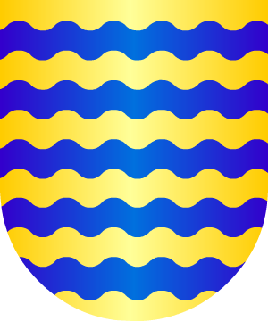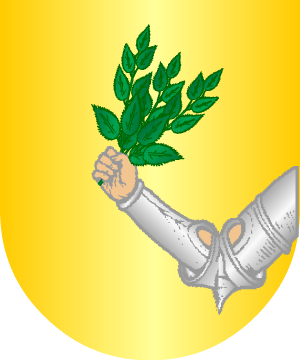 En campo de oro, una torre de piedra, acostada de dos álamos de sinople.