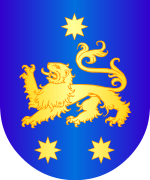 En campo de azur, un león rampante de oro, y en el jefe, tres crecientes
