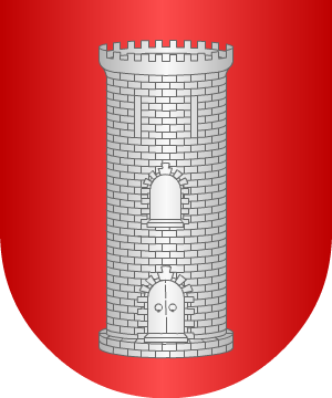 de sinople y dos lobos de sable atravesados al tronco. Bordura cosida, de oro,