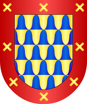 3.- Una segunda modificación sufrieron poco después las armas primitivas: Escudo lleno de cinco órdenes de veros de oro y azur. Bordura de gules, con el cordón de San Francisco de oro.