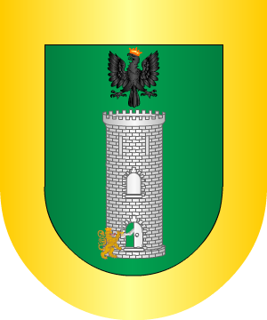 de oro, coronado del mismo metal y colocado bajo la puerta. Bordura de plata,