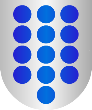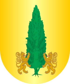 5.- Otros: Partido: 1º, en campo de oro, un árbol arrancado de sinople y dos lobos de sable andantes al pie del tronco, y 2º, en campo de plata, un árbol arrancado de sinople y un lebrel parado al pie del tronco y atado a él con una cadena, y sobre la cabeza del lebrel una flor de lis. En la copa del árbol un dragón o sierpe.