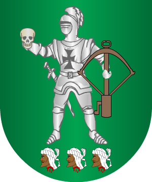 Escudo cuartelado: 1º, en campo de oro, tres llaves y tres medias lunas, y bordura de sinople con siete aspas; 2º, en campo de gules, un león rampante, y bordura de plata con ocho flores de lis de sinople; 3º, en campo de sinople, un castillo sobre una roca, y bordura de plata con siete aspas de oro, y 4º, en campo de oro, dos cabras.