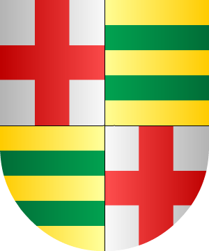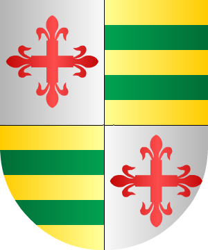 2.- Otros de la casa solar de Laredo y los de Castilla y León traen: Escudo cuartelado: 1º y 4º, en campo de plata, una cruz flordelisada de gules, y 2º y 3º, en campo de oro, dos fajas de sinople.