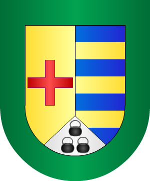1.- En campo de oro, una cruz de gules; partido de azur, con tres fajas de oro y entado en punta, de plata, con tres calderas de sable mal ordenadas. Bordura de sinople.
