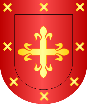 11.- Otros traen: En campo de gules, una cruz hueca y floreteada de oro; bordura cosida de gules, con ocho aspas, de plata.