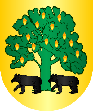 1.- En campo de oro, un roble de sinople frutado de oro y dos osos de sable pasantes al pie del tronco.