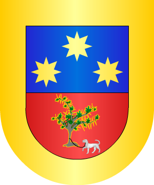 3.- Otros Alcober, traen: Escudo partido: 1º, en campo de oro, un castillo de plata, 2º, en campo de oro, un lobo andante, de gules; bordura general de plata, con ocho armiños de sable. Divisa: “Fidelitas et omnia vincit”, puestas en letras de plata, sobre un volante de azur.