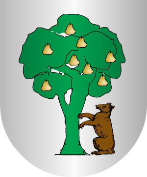 63.- tros traen: En campo de sinople, un puente de piedra de tres arcos y una bandera de plata, con el asta quebrada.