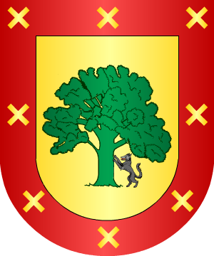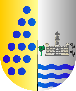 de gules, un castillo de oro, aclarado de azur, y 2º y 3º, en campo