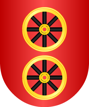 gules, con dos calderas de sable, y, en cada uno de sus cuatro ángulos,