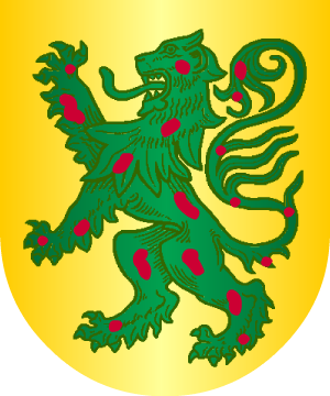 a su lado diestro, un león de gules, y al siniestro, un lobo de sable,