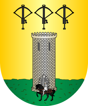 1.- De plata, un escusón de oro con cuatro palos de gules, colocado en jefe; y en punta, dos pinos de sinople y entre ellos dos jabalíes pasantes de sable.