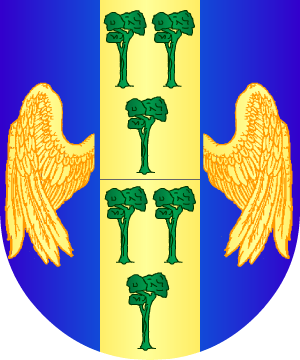 10.- Otros: Escudo cuartelado en aspa: 1º y 4º, en campo de oro, tres pinos de sinople, terrasados, y 2º y 3º, en campo de azur, un ala de plata.