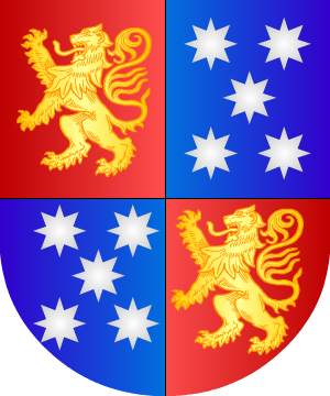 6.- Otros de Valencia traen: Escudo cuartelado en sotuer: 1º y 4º, de azur, medio vuelo de plata; 2º y 3º, de oro un monte de tres picos naciente de la punta y sumado de un árbol, todo de sinople.