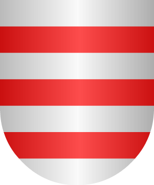 50.- Los originarios de La Bañeza (León), según Vicente de Cadenas, traen: En campo de gules, sobre rocas, de oro, un castillo de plata, aclarado de gules y con una bandera en su torre del homenaje, surmontado de tres lises de oro, puestas en jefe y en faja.