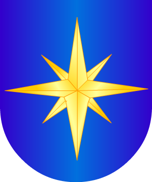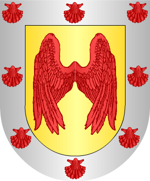 gules, con dos calderas de sable, y, en cada uno de sus cuatro ángulos,