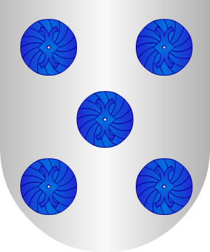 gules, con dos calderas de sable, y, en cada uno de sus cuatro ángulos,
