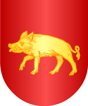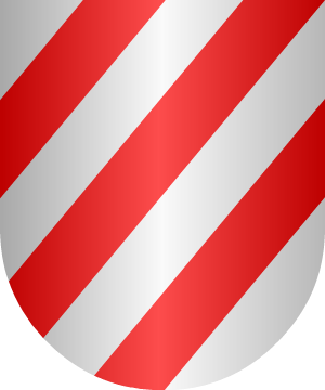 Son sus armas: En campo de plata, una banda de gules engolada de dragantes de sinople, y acompañada de dos lobos andantes de sable. Bordura de plata con ocho armiños de sable.