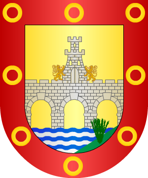 3.- Estas primitivas armas fueron después modificadas en la forma siguiente: En campo de gules, un puente de plata de tres arcos, bajo el que corre un río. Sobre el puente, una torre también de plata, sumada de una bandera de oro, y en la orilla del río una terrasa de sinople, y en ella una mata de romero del mismo color; bordura de oro, con ocho arandelas de lanza, de azur.