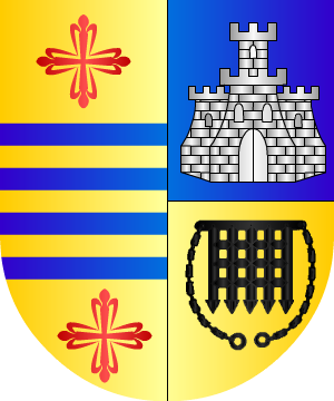 1º, en campo de oro, cuatro fajas, de azur, y dos cruces de Calatrava,