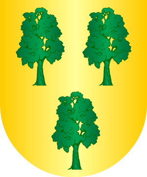 20.- Los Armengol, radicados en Badajoz, según Vicente de Cadenas, traen: En campo de plata, tres encinas de sinople, puestas dos y una; bordura de gules, con una espada puesta en su jefe.
