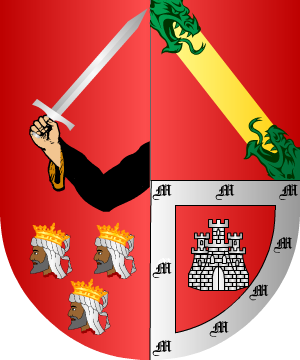 de oro y gules. 9.- Otros Armengol o Ermengol, en Cataluña, Andalucía y Mallorca traen: En campo de gules, un brazo armado, de plata, moviente del franco siniestro, y empuñando una espada desnuda del mismo metal. 10.- Otros Armengol o Ermengol, en Cataluña, Andalucía y Mallorca traen: En campo de oro, un brazo armado, de plata, moviente del franco siniestro, y empuñando una espada desnuda del mismo metal. 11.- Johan Baptiste Rietstap señala para los Armengol o Ermengol, en Cataluña, Andalucía y Mallorca: En campo de oro, un brazo armado, de plata, moviente del franco siniestro, y empuñando una espada del mismo metal, guarnecida de oro. 12.- Esclaramunda de Armengol, descendiente de la primera línea de los Condes de Urgel, fue sucesora de todo aquel estado, casó con su pariente Suñer el atrevido, el cual de Barcelona y de sus sobrinos fue Gobernador. Usaba por armas: Escudo cortinado. 1º y 2º, en campo de gules, barras de oro, y la capa o chapé. ajedrezado de oro y sable, que es la divisa propia de Suñer. 13.- Los Armengol, Barones de Rocafort de Queralt, también en Cataluña, traen: Escudo ajedrezado de oro y sable; partido y fajado de oro y gules, y entado en punta, de oro, con una vaca de gules, andante. 14.- Los Barones de Rocafort de Queralt, también en Cataluña, usan: Escudo mantelado: 1º ajedrezado de oro y sable; 2º, fajado de oro y gules, y el mantel de oro, con una vaca de gules, andante. 15.- Otros Armengol aragoneses, según Pedro Vitales, ostentan: En campo de plata, una espada de azur, puesta en palo y con la punta hacia el jefe, acostada a la diestra de un vaso de gules, salpicado de oro, y a la siniestra de una perdiz parda, picada y armada de gules. 16.- Los Armengot, de Aragón, según Pedro Vitales, traen: En campo de plata, una espada de azur, guarnecida de sable, puesta en palo y con la punta hacia el jefe, acostada a la diestra de un vaso de gules, salpicado de oro, y a la siniestra de una perdiz parda, picada y armada de gules. 17.- Dicen algunos tratadistas que otra familia Armengol o Ermengol de Cataluña, trae: Escudo partido: 1º, fajado de seis piezas, de oro y azur (Armengol), y 2º, en campo de gules, tres chevrones de plata (Montarnés). 18.- Otra rama, en Cataluña y Aragón traen: Escudo cuartelado: 1º y 4º, losanjado de oro y sable, y 2º y 3º, de oro, un losange, de sable; bordura general almenada de sable, de ocho piezas. 19.- Otros Armengol, en Cataluña y Aragón, traen: Escudo cuartelado: 1º y 4º, losanjado de oro y sable, y 2º y 3º, las armas de Aragón, y sobre ellas un losange, de sable; bordura general almenada de sable, de ocho piezas. 20.- Los Armengol, radicados en Badajoz, según Vicente de Cadenas, traen: En campo de plata, tres encinas de sinople, puestas dos y una; bordura de gules, con una espada puesta en su jefe. 21.- Los Armengot traen: En campo de oro, un árbol, de sinople, frutado de gules, sobre terrasa de sinople; bordura jaquelada de oro y sable, en dos ordenes. 22.- Otros Armengol o Ermengol traen: En campo de oro, tres fajas, de gules. 23.- Otros traen: Escudo fajado de seis piezas, tres de oro y tres de azur. 24.- Otros traen: Escudo fajado de seis piezas, tres de gules y tres de oro. 25.- Otros de Cataluña, traen: Escudo cuartelado: 1º y 4º, escaqueado de oro y sable, y 2º y 3º, en campo de oro, dos palos, de gules. 26.- Otros de Cataluña, traen: Escudo cuartelado: 1º y 4º, escaqueado de oro y sable, y 2º y 3º, en campo de oro, dos fajas, de gules. 27.- Los Armengol de Torroella de Montgrí: Escudo cortado y enclavado de tres de oro, y escacado de oro y sable. 28.- Los de Hinojosa (Badajoz), traen: Escudo mantelado: 1º, en campo de gules, dos bandas blancas con perfiles negros, 2º, jaquelado de oro y sable, y 3º o mantel, de oro, con una vaca, de gules. 29.- Otros traen: Escudo partido: 1º, en campo de gules, dos fajas, de plata, y 2º, en campo de oro, un buey, de gules. 30.- Otros usan: De…, una mano palmeada de... 31.- En otro expediente, perteneciente al Caballero de la Orden de San Juan, Pedro A. Paguera y Armengol, año 1767, natural de Barcelona: Escudo partido en palo: 1º, escaqueado (ajedrezado) de oro y sable, 2º, tres fajas de oro y tres de gules, y 3º, en punta, en campo de oro, una vaca pasante, de gules. 32.- En el expediente del Caballero Pedro Jerónimo Net Montaner y Armengol, natural de Mallorca, año 1738, constan las siguientes armas: En campo de oro, un brazo armado con un estoque en la mano. 33.- En el expediente del Caballero de la Orden de San San Juan, Federico Armengol constan las siguientes armas: Escudo partido: 1º, dos bandas, y 2º, ajedrezado y cortinado un buey (sic). 34.- En el expediente del Caballero de la Orden de San Juan, Ramón Calders Meca y Armengol, año 1595, se citan estas armas: Un escudo ajedrezado de oro y sable, con una vaca de gules y collar de plata en campo de plata (sic). Información de estos linajes complementada por cortesía de blasonari.net |