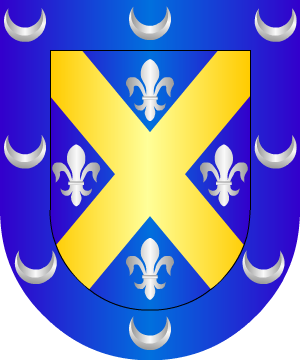 12.- Esclaramunda de Armengol, descendiente de la primera línea de los Condes de Urgel, fue sucesora de todo aquel estado, casó con su pariente Suñer el atrevido, el cual de Barcelona y de sus sobrinos fue Gobernador. Usaba por armas: Escudo cortinado. 1º y 2º, en campo de gules, barras de oro, y la capa o chapé. ajedrezado de oro y sable, que es la divisa propia de Suñer.