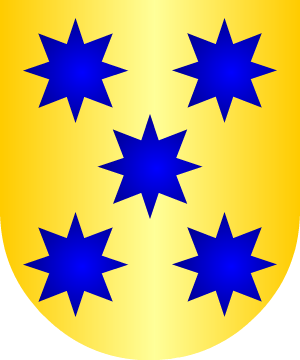 oro y gules, y un león rampante del uno en el otro. Bordura de azur,