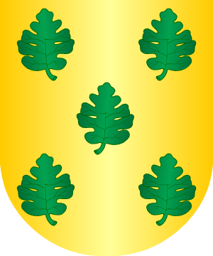En campo de gules, una banda de oro, engolada en cabezas de dragantes, de sinople,