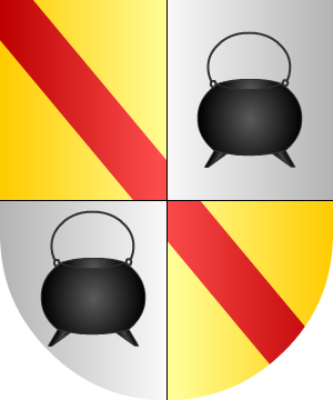 campo de gules, una banda de oro engolada en cabezas de dragones de oro. 2.- Después tomaron dos calderas de sable, una arriba