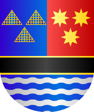 campo de gules, una banda de oro engolada en cabezas de dragones de oro. 2.- Después tomaron dos calderas de sable, una arriba