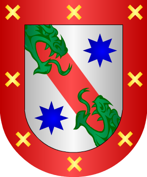 5.- Los originarios de Crémenes (León) y radicados en Madrid, según Vicente de Cadenas, usan: En campo de gules, cinco veneras de plata, puestas en aspa; bordura de plata, con ocho castillos de gules.