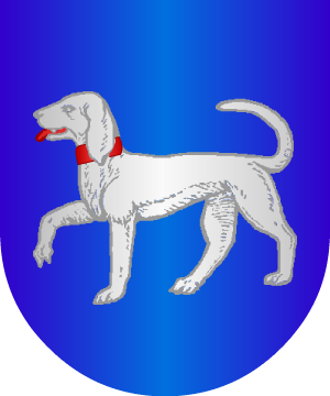 De oro, una cadena de sable puesta en banda. Bordura de plata con cinco panelas de sinople.