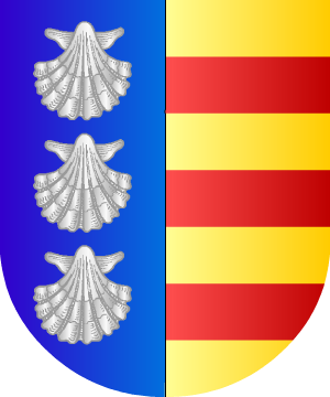 2.- Los Aymar traen: Escudo cortado: 1º, de gules, un monte de oro, y 2º, de plata, cuatro fajas ondeadas de azur.