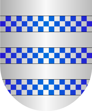6.- Otros traen: Escudo partido: 1º, de azur, y 2º, de gules; brochante, una cruz llana, de plata.