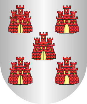 En campo de plata, cinco castillos, de gules, aclarados de oro y puestos en