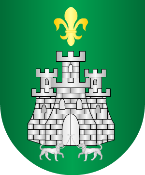del castillo, y tapando a ésta, un árbol de sinople y dos perros