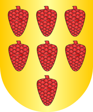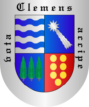 de gules. 19.- Los Clemente de Murcia tienen: Escudo partido: 1º, en campo de oro, una banda de sinople cargada de tres flores de lis de oro, y 2º, en campo de plata, dos llaves, una de azur y otra de gules, puestas en sotuer. 20.- En el Archivo Municipal de Murcia constan: Escudo partido: 1º, en campo de oro, una banda de sinople cargada de tres flores de lis de oro, y 2º, en campo de plata, dos llaves de gules, puestas en banda. 21.- Otros: En campo de sinople, cinco castañas, de oro, puestas dos, dos y una. 22.- Los Clemente, radicados en Granada, según Vicente de Cadenas, usan: En campo de azur, sobre terrasa de sinople, un ciervo, parado, de oro. 23.- Otros Climent: Escudo partido: 1º, un árbol arrancado de tres ramas, y 2º, un ciervo en salto. 24.- Algunos Climent: Escudo cortado: 1º, en campo de azur, una mata, de oro y 2º, en campo de plata, un lobo, de sable. 25.- Los Clemente, de Portugal, usan: En campo de azur, siete estrellas de seis rayos de oro, puestas una, dos, una, dos y una. Timbre: Una estrella del escudo. 26.- Los Climente, originarios de Sangüesa (Navarra), según Vicente de Cadenas, traen: Escacado de veinte compones, diez de oro y diez de gules. 27.- Los Climente, según José Pellicer y Tobar, usan: En campo de azur, tres escobas de plata con ataderos de gules, perfilados de oro. Bordura de gules con ocho aspas de oro. 28.- Los Clement: En campo de oro, una cruz llana, de gules, que cuartela el escudo y en cada cuartel, un águila, de azur. 29.- Los Clemente Cabeza de Vaca de Mula y Cartagena, originarios de Aragón, ostentan: Escudo partido: 1º, en campo de gules, dos fajas de oro; en el jefe, dos estrellas del mismo metal puestas en situación de faja, y en punta, un ramo de tres peras de oro, que algunos pintan de su color natural, por Clemente, y 2º, en campo de oro, una cabeza de vaca de gules y adiestrada; medio cortado y jaquelado de oro y gules, por Cabeza de Vaca. 30.- En el expediente del Caballero de la Orden de Santiago Nicolás Alvarez de la Barreda y Clemente de Aróstegui, natural de Villanueva de la Jara, consta que este linaje fue reconocido en las casas de su propiedad en Villanueva de la Jara, sitas en la calle mayor y también en el convento de San Francisco de dicha villa, "tiene dos cuarteles, en el de la derecha un pino en campo de oro y dos perros unidos al tronco, y en el de la izquierda dos estrellas en campo de plata". 31.- En el expediente de hidalguía de Alonso Clemente y Pérez, natural de Horche (Guadalajara), año 1760, constan las siguientes armas: Escudo cuartelado: 1º y 4º, en campo de plata, un águila con las alas extendidas con pie y pico de oro, y 2º y 3º, en campo de azur, una corbeta de oro con su cadenilla. 32.- El Chantre Climent, de Aragón, usaba: "Cruces blancas en campo vermello y un castillo en cárdeno". Información de estos linajes complementada por cortesía de blasonari.net |