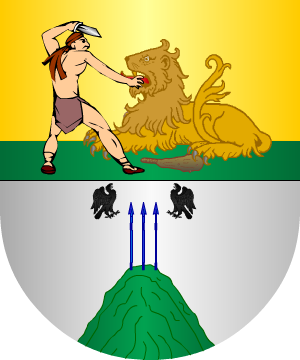 2.- Otros usaron: En campo de sinople, una casa fuerte, de plata, con dos torres, sumada de un sol, de oro.