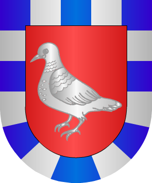 volante, con una rama de olivo de sinople, en el pico. 10.- Los radicados en las Islas Baleares, según Vicente de Cadenas, usan: En campo de plata, una colomba, de azur, manchada de sable, con una rama de oliva en el pico, de sinople, y, en punta, ondas de azur y plata. 11.- Los de Torroja (Tarragona) usan: En campo de oro, una banda de azur. Jefe de gules. 12.- Los de Castilla, según Vicente de Cadenas, traen: En campo de azur, una pira, de plata. Jefe de oro. 13.- Según Rietstap, los Colomb, de Vevey, traen: En campo de gules, una paloma, de plata, puesta sobre un cerro, de sinople, en la forma que se dibuja. 14.- Según Rietstap, los Colomb, de Quercy, traen: En campo de azur, un cabrio, de oro, surmontado de un creciente, de plata, y acompañado en jefe de dos estrellas de lo mismo, y en punta de una paloma también de plata. 15.- Según Rietstap, los Colomb, de Provenza, traen: Escudo cortado: 1º, de azur, una paloma, de plata, acompañada de tres estrellas de lo mismo, 2º, de plata, una cruz de Lorraine, de gules, naciente de la punta. 16.- Otros, según Juan Francisco de Hita, traen: En campo de gules, una paloma de plata, armada de oro. 17.- En el sello de Guillermo Colom y de Dusay, de 1435, constaban las siguientes armas: En campo de oro, una paloma de sable. Bordura componada de ocho piezas de lo mismo. 18.- En Perelada (Gerona) constan: Una paloma contornada y mirando a la diestra. 19.- Los de Cataluña, según Vicente de Cadenas, usan: En campo de gules, una palma, de plata. Bordura componada de tres almenas, y en cada una traen: en plata, una paloma parda volando con un ramo de oliva de sinople en el pico, y en punta, ondas de mar. Información de estos linajes complementada por cortesía de blasonari.net |