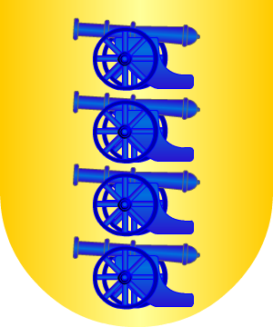 de oro y gules, en tres órdenes. Cimera de brazo con bocamanga de Teniente