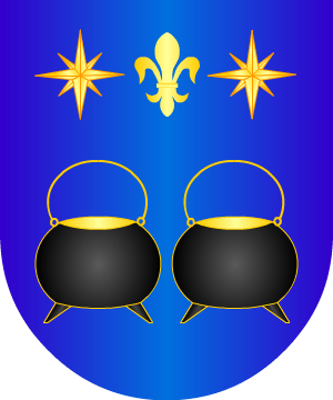 1.- Los de Guipúzcoa usan: En campo de azur, dos calderos de sable, puestos en faja y perfilados de oro, con bocas y asas del mismo metal, acompañados, en el jefe, de una flor de lis de oro, puesta entre dos luceros, también de oro.