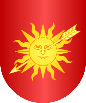 2.- Otros: En campo de gules, un sol al natural, los rayos de oro, y atravesado el sol por una flecha de oro.
