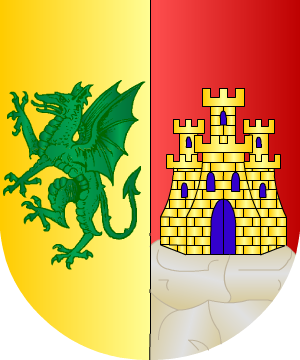 1.- En campo de oro, dos bandas de sinople, acompañadas de cinco bezantes de azur, tres en el hueco del centro y uno en cada lado.