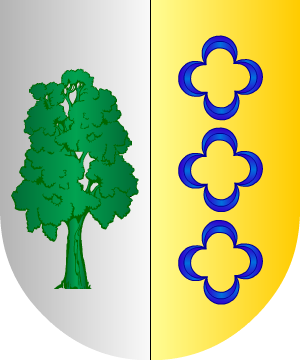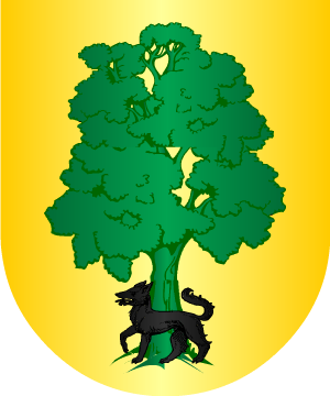 En campo de oro, un árbol de sinople y un lobo de sable atravesado al pie del tronco.