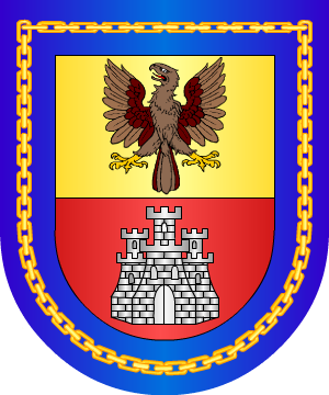 En campo de azur, sobre ondas de azur y plata, una torre, de oro, almenada, mazonada de sable y aclarada de gules, sumada de un brazo alado, de plata, con una espada en la mano.