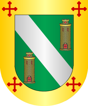 En sinople, una banda, de plata, acompañada de dos torres, de oro, almenadas, donjonadas y mazonadas, de sable y aclaradas de gules. Bordura de oro, con cuatro cruces de Covadonga, de gules. (Ref.: CADENAS) |
