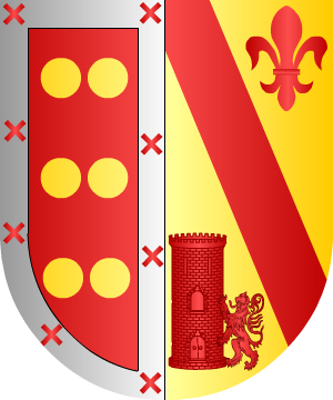 Cuartelado: 1º y 4º, jaquelado de doce piezas de oro y azur; bordura de plata con ocho armiños de sable. 2º y 3º, en azur, un león rampante de oro; bordura de oro. (Ref.: CADENAS). |