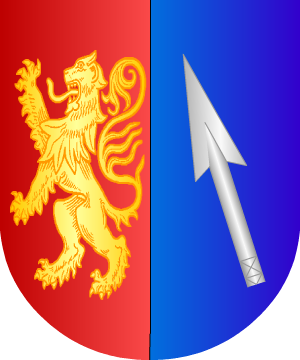 En oro, una muralla, de su color, con cinco caballeros delante de ella, armados y vestidos de plata. (Ref.: CADENAS). |